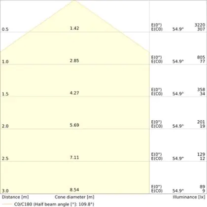 Der Abstrahlwinkel bezeichnet den Winkel, in dem das Licht aus der Lichtquelle ausgestrahlt wird. Er wird in Grad (D) angegeben. Je geringer die Gradzahl des Abstrahlwinkels ist, desto kleiner ist auch der Durchmesser des Lichtkegels, den die Lichtquelle produziert. Beispiel: Wird eine Lampe mit einem Abstrahlwinkel von 60 Grad an der Decke (2,5 m Höhe) angebracht, erzeugt sie einen Lichtkegel von 2,9 Metern Durchmesser. Hat die Lampe hingegen einen Abstrahlwinkel von 120 Grad, beträgt der Lichtkegel 8,7 Meter im Durchmesser. |
