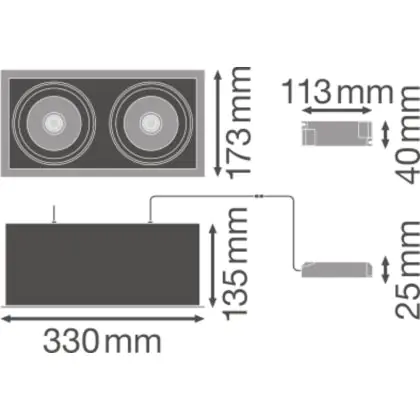 Der Ledvance LED-Spot Quadrat Multi schwenkbar Schwarz-Weiß 2x30W 5400lm 38D - 830 Warmweiß | Ausschnitt 320x160mm ist ein LED-Einbaustrahler, welcher Licht in der Farbtemperatur 3000K - Warmweiß ausstrahlt und durch eine lange Lebensdauer punktet. Die Einbauleuchte ersetzt konventionelle Halogenstrahler.