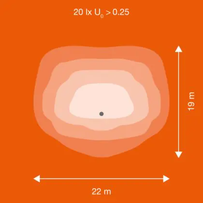 Der Abstrahlwinkel bezeichnet den Winkel, in dem das Licht aus der Lichtquelle ausgestrahlt wird. Er wird in Grad (D) angegeben. Je geringer die Gradzahl des Abstrahlwinkels ist, desto kleiner ist auch der Durchmesser des Lichtkegels, den die Lichtquelle produziert. Beispiel: Wird eine Lampe mit einem Abstrahlwinkel von 60 Grad an der Decke (2,5 m Höhe) angebracht, erzeugt sie einen Lichtkegel von 2,9 Metern Durchmesser. Hat die Lampe hingegen einen Abstrahlwinkel von 120 Grad, beträgt der Lichtkegel 8,7 Meter im Durchmesser. |