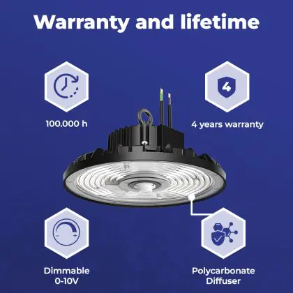 Wir von BeleuchtungDirekt haben mit der LED-Hallenleuchte von Noxion gute Erfahrungen gemacht. Daher bieten wir Ihnen für dieses Produkt eine Garantie von 4 Jahre an.