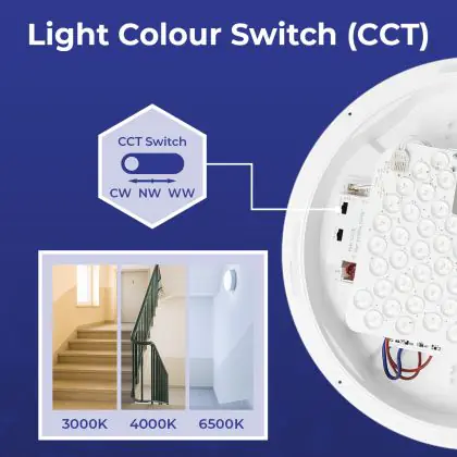 Die LED-Feuchtraumleuchte kommt mit der Farbtemperatur 3000K - 4000K - 6500K CCT daher. Als Faustregel gilt: Je niedriger der Kelvinwert, desto gemütlicher wirkt das Licht.