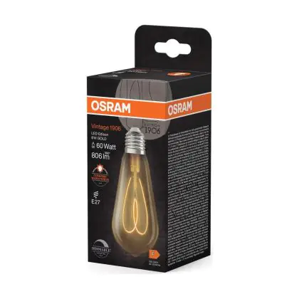 Die Osram Vintage 1906 LED E27 Edison Fadenlampe Gold 8W 806lm - 922 Extra Warmweiß | Höchste Farbwiedergabe - Dimmbar - Ersatz Für 60W ist eine effiziente E27 LED-Lampe mit Retrodesign und der perfekte Ersatz für Ihre konventionellen 60W Lampen mit E27. Zudem strahlt sie Licht in der Farbtemperatur 2200K - Extra Warmweiß aus und punktet durch eine lange Lebensdauer.
