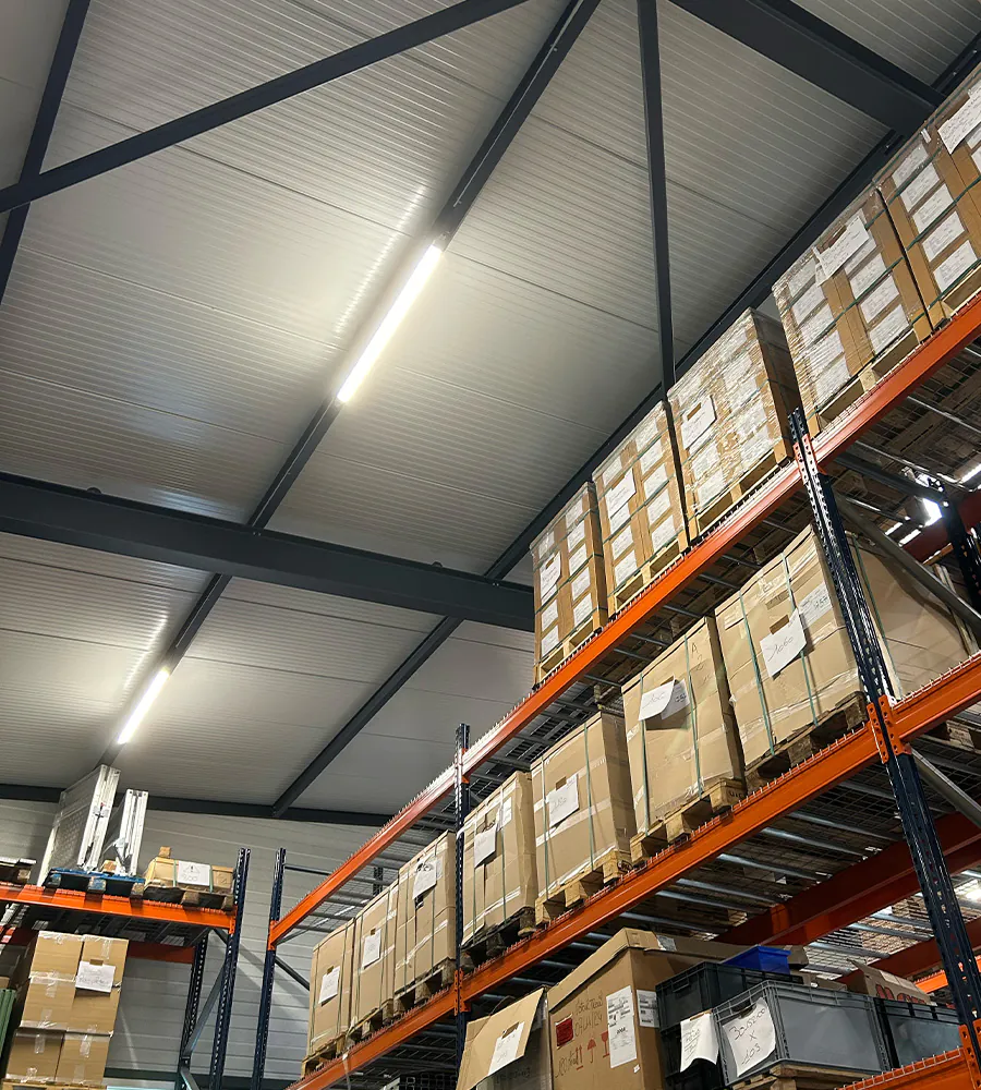Unser Projektberater schlug daher eine duale Beleuchtungslösung vor: hochintensive LED-Beleuchtung für die Arbeitsbereiche und eine diffusere Beleuchtung für die Lagerbereiche.